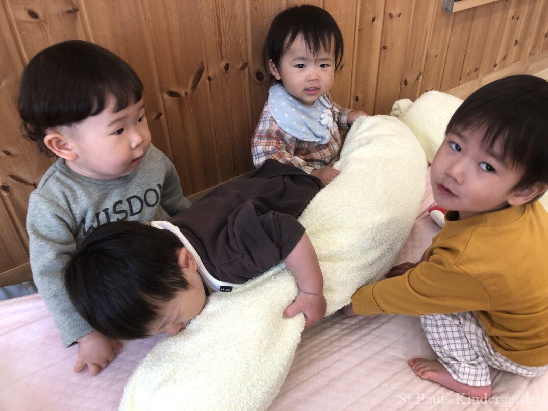 ふわふわのお布団にみんな集まってぎゅーっと気持ち良さそうにしています。