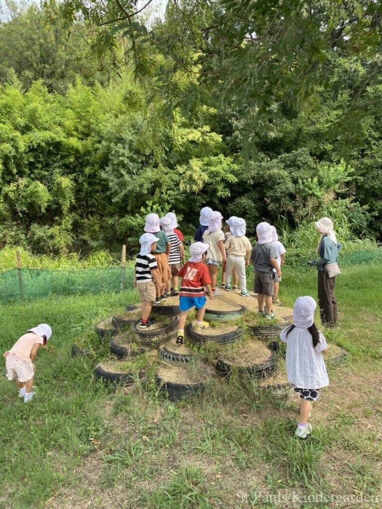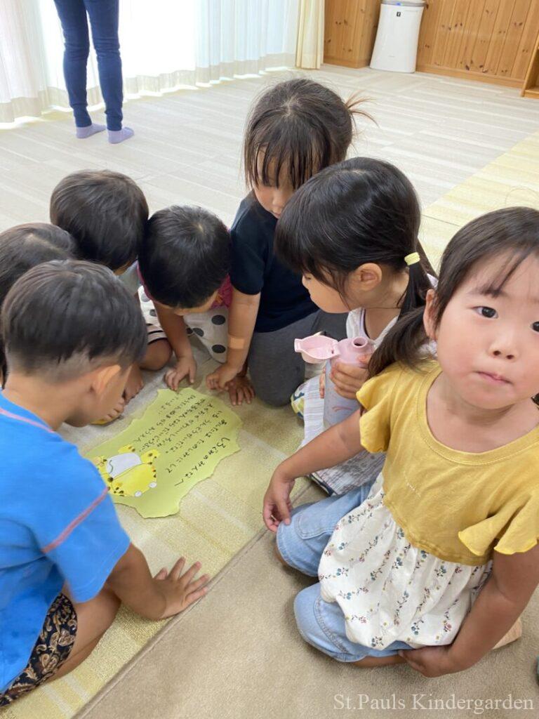 園庭奥の池が絵本に出てくるひょうたん沼に見えるなぁ〜とポツリ呟いたことがはじまり、そこから今日は沼にいるうしがえるに会えるかなぁ〜と毎日のぞいては楽しみにしていました。