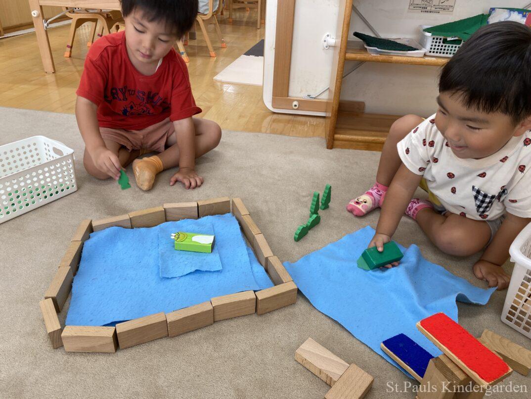 園庭奥の池が絵本に出てくるひょうたん沼に見えるなぁ〜とポツリ呟いたことがはじまり、そこから今日は沼にいるうしがえるに会えるかなぁ〜と毎日のぞいては楽しみにしていました。