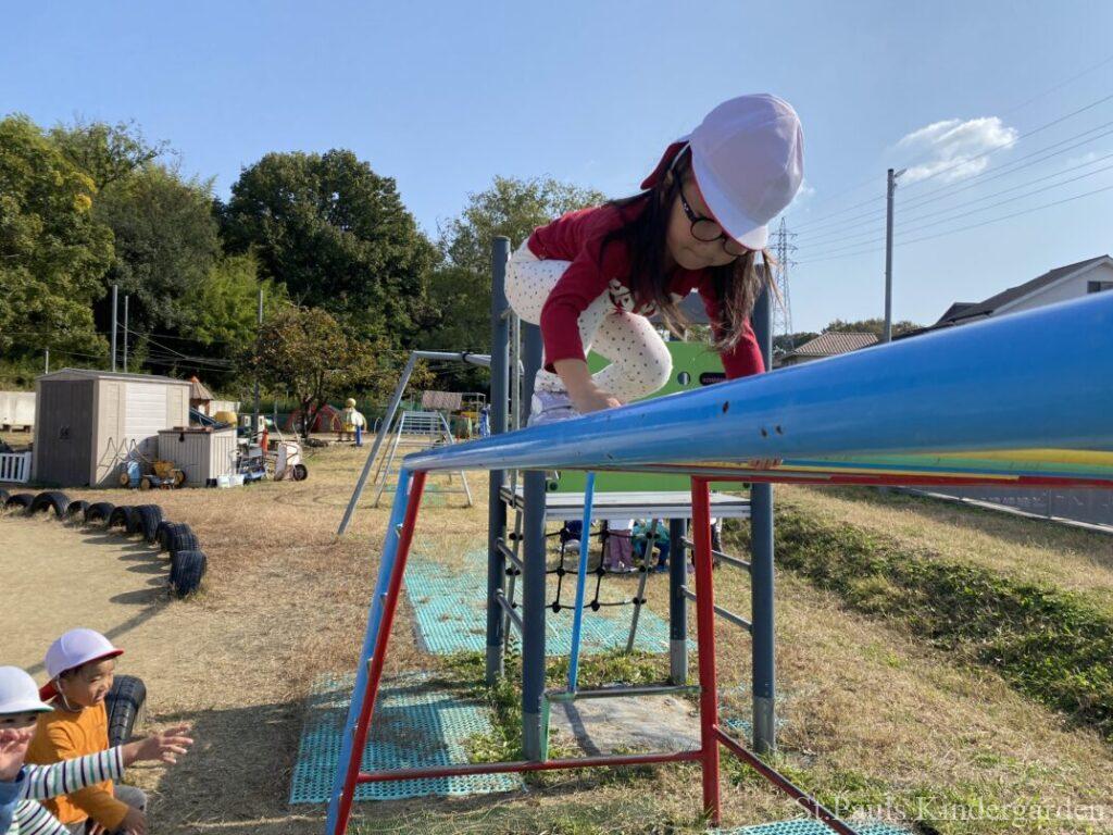園庭ではちょっと難しい遊具にもチャレンジしていますよ。、