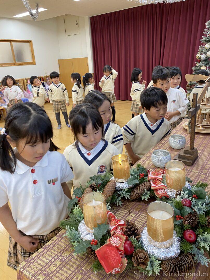クリスマスを迎えるための大切なアドベント礼拝。園舎全体がクリスマスの装飾になり、子どもたちはとてもワクワクした様子でした。