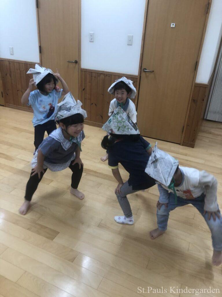 どすこい!新聞紙で兜を作っておすもう大会の特訓をするお友だちも!