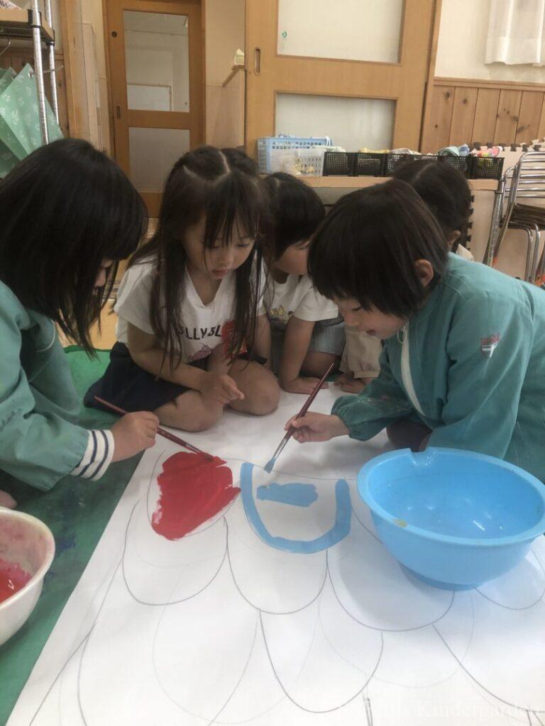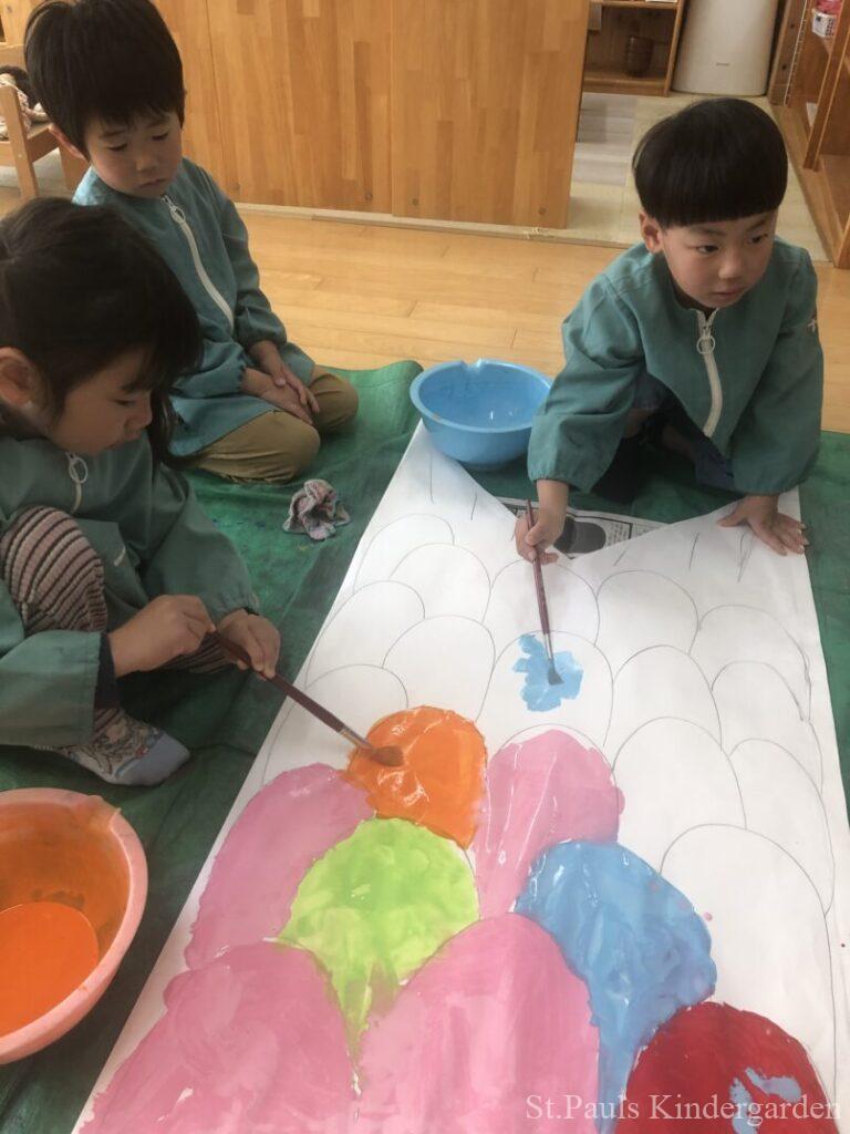 子どもの日まつりに向けてクラスで2つの大きなこいのぼりを作りました。