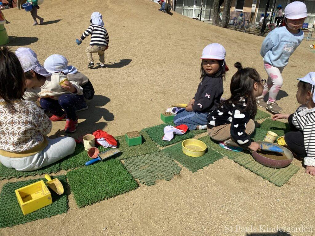 遠足が終わった、お天気のいい日には人工芝を並べてピクニックごっこ🧺