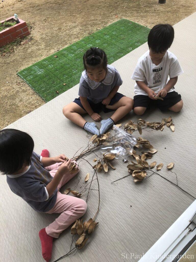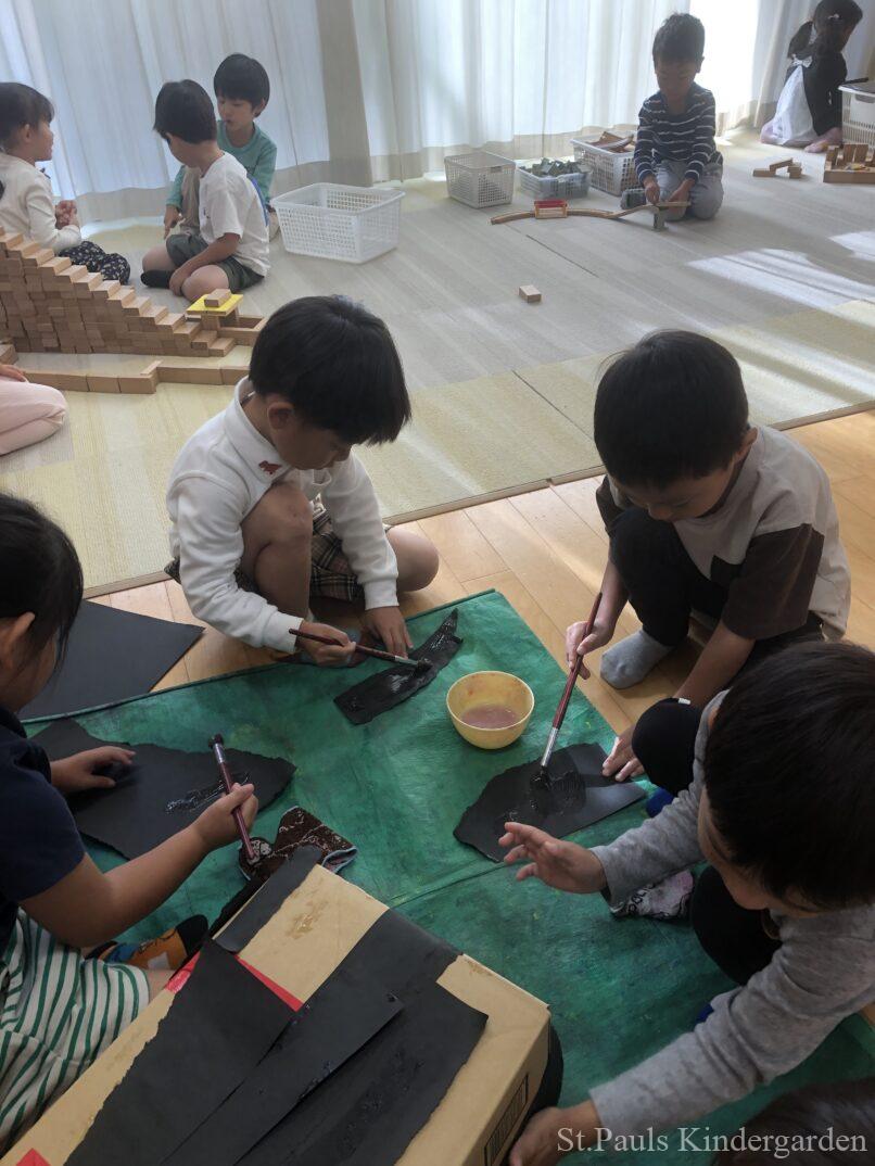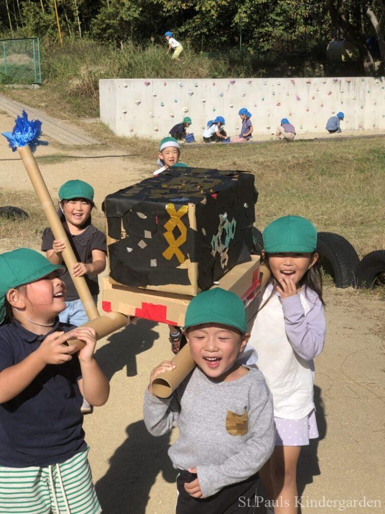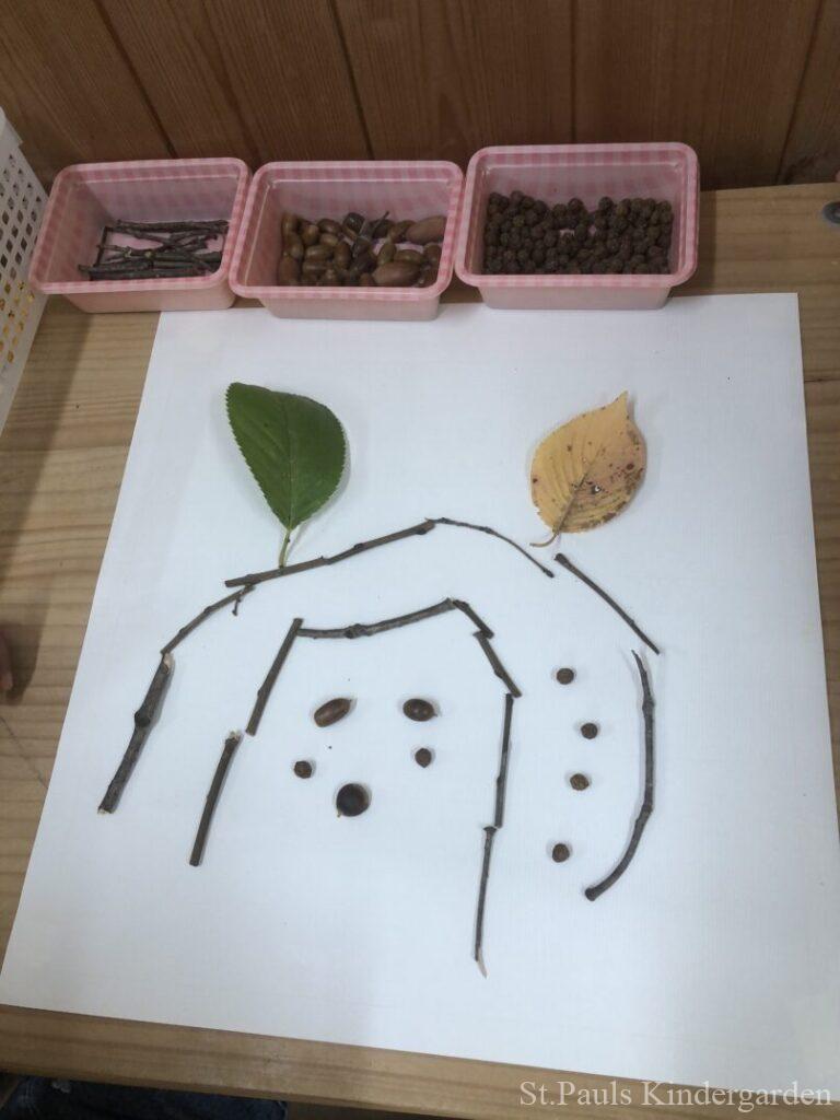 緑組だより クラスだより 2025.10.31 10月 朝晩やっと涼しくなり、秋らしくなってきましたね。 遠足で拾ったどんぐりや木の枝を使ってコマを作ったり絵を描いて表現しました 遠足で電車に乗った経験からクラスでも電車作りが始まりました! また電車とは違う物も作り始め‥ よーいやさー!お神輿の完成です! 秋がどんどん深まり遊びも自然を取り入れた物も増えていきそうです!朝晩冷えてきました。風邪等に負けず元気に過ごしていきたいと思います。