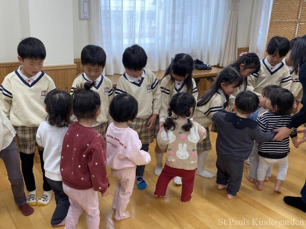 お別れ会では、各クラスから青組さんへ手遊びや歌のプレゼントがあり、子どもたちは優しい表情で嬉しそうにきいていましたよ。