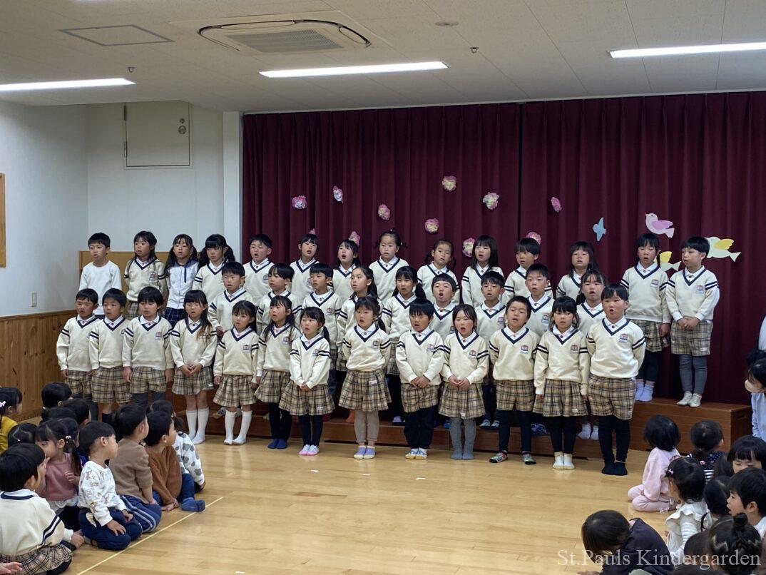 お別れ会では、各クラスから青組さんへ手遊びや歌のプレゼントがあり、子どもたちは優しい表情で嬉しそうにきいていましたよ。